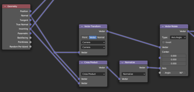 The rotation performed uses the axis-angle method where the axis is the cross product of the incoming vector (camera forward vector) and existing normal.